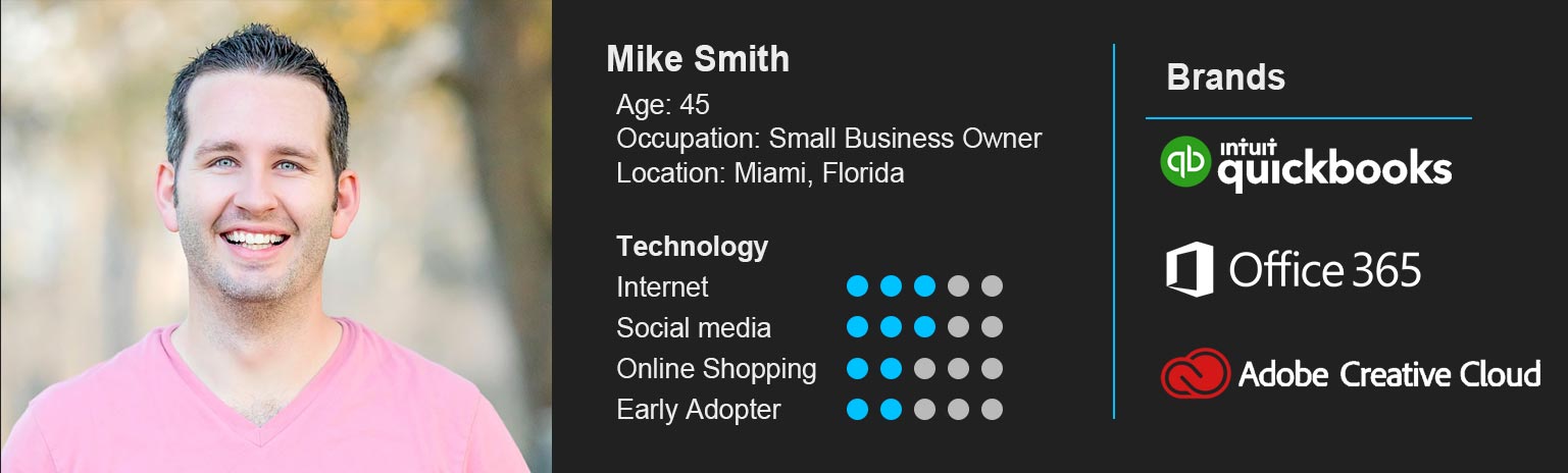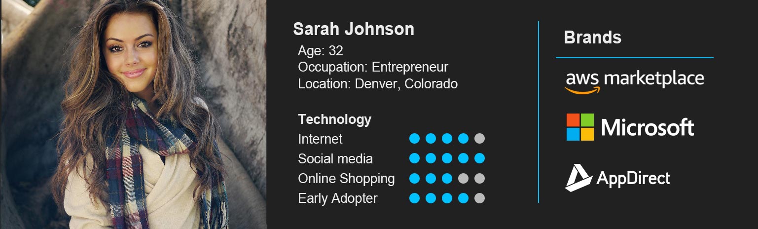 Sarah is active on social media applications such as Twitter and LinkedIn, regularly attends industry conferences and events. These behaviors can be leveraged to help her with her marketing and advertising efforts, as well as her research on e-commerce applications and software vendors.