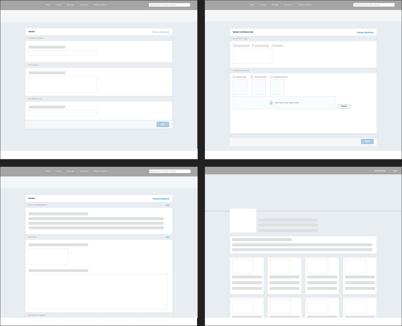 Starting with wireframes I focused on creating a seamless storefront creation for both small businesses and large enterprises, engineering an intuitive interface that would empower users to build their storefronts with lightning-fast efficiency. For small businesses, we designed a frictionless onboarding experience with smart templates and customization tools, while for larger enterprises, we architected a robust application with advanced features like multi-store management. The wireframes highlighted popular design trends, laying the groundwork for an innovative storefront creation.
