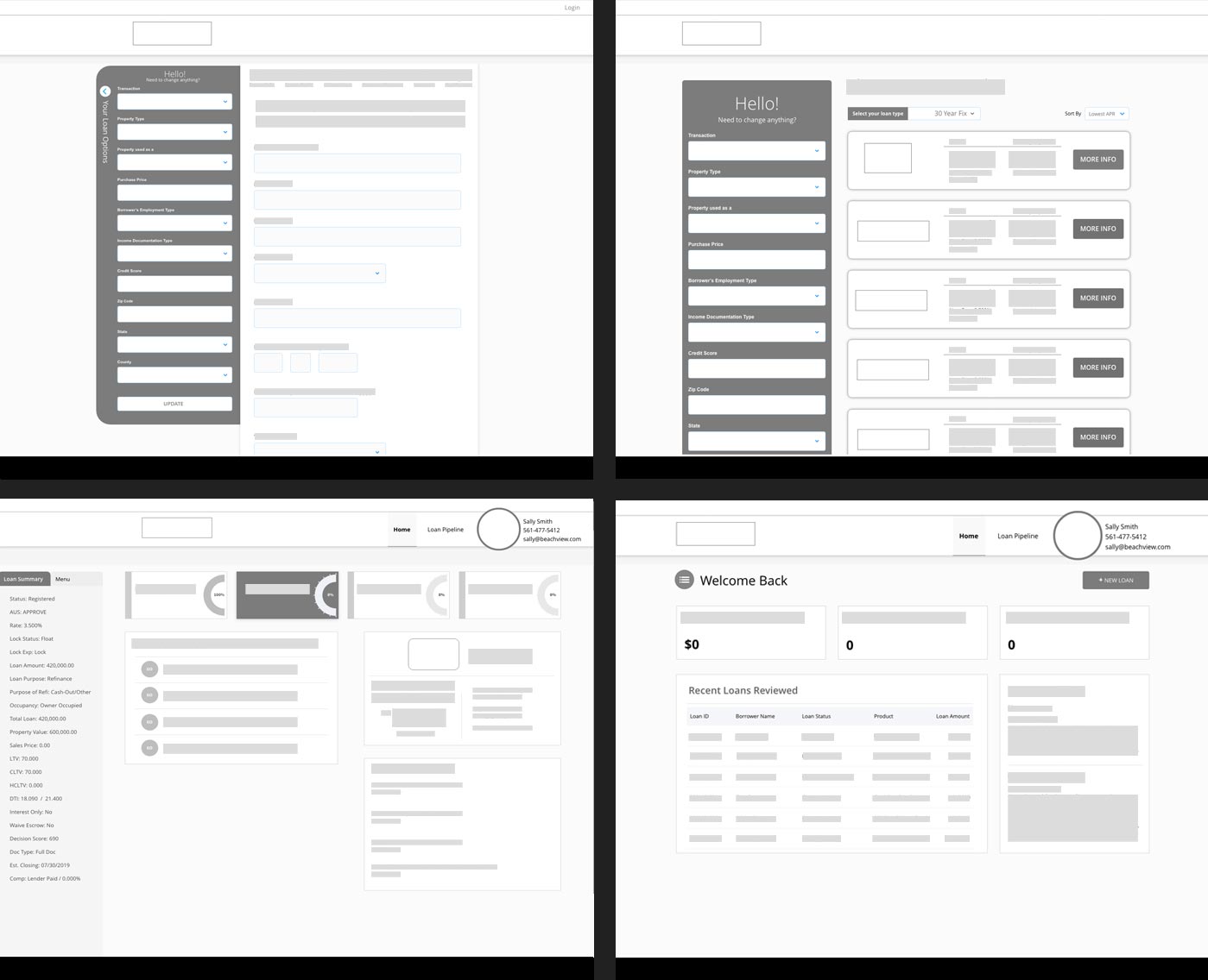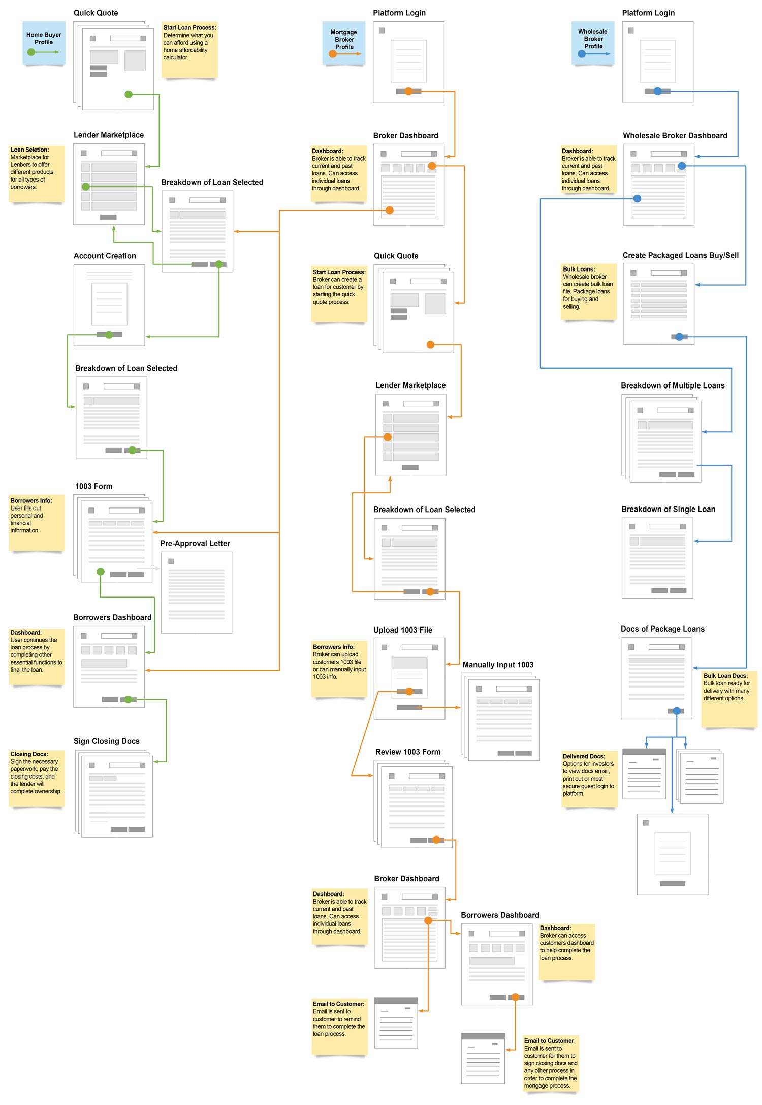 The wireframes showcased a seamless, intuitive interface for three key user groups: homebuyers, mortgage brokers, and wholesale mortgage buyers/sellers. For homebuyers, we engineered a frictionless point-of-sale (POS) experience with smart loan recommendations. Mortgage brokers were empowered with a robust dashboard featuring real-time collaboration tools and predictive analytics for optimal loan matching. The wholesale segment received a marketplace with dynamic pricing algorithms and one-click bulk transaction capabilities. Our holistic approach covered the entire mortgage lifecycle, from initial application to closing. By incorporating mobile-first responsive design and cloud-based synchronization, we ensured a flawless experience across all devices, setting a new standard for user-centric innovation in the mortgage industry.